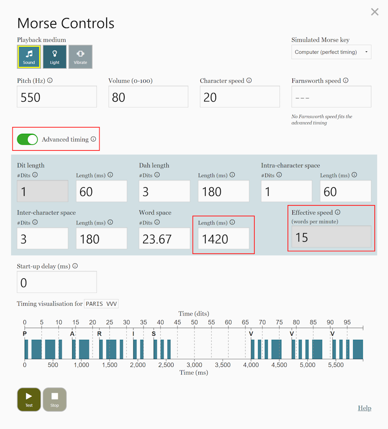 $$ t_{wspace} = 7 \times t_{wdit} = {300 s_{wpm} - 258 s_{word} \over 5 s_{wpm} s_{word}} \text{ seconds} $$The Morse Controls dialogue in the Morse Code World training tools does not directly support Wordsworth timing, but by opening the “Advanced timing” section, the word-space can be increased manually while keeping an eye on the “Effective Speed” value to achieve the effective words per minute required: